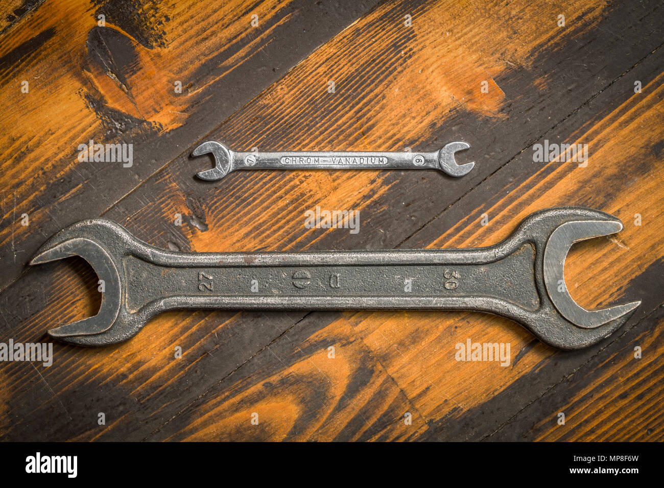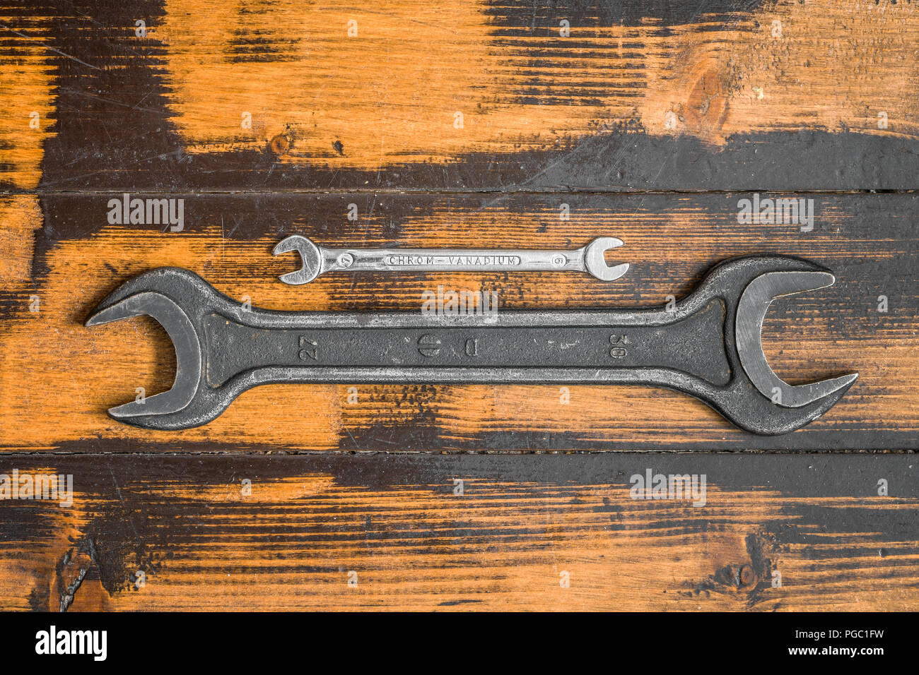 Gross Und Klein Zwei Schraubenschlussel Auf Holz